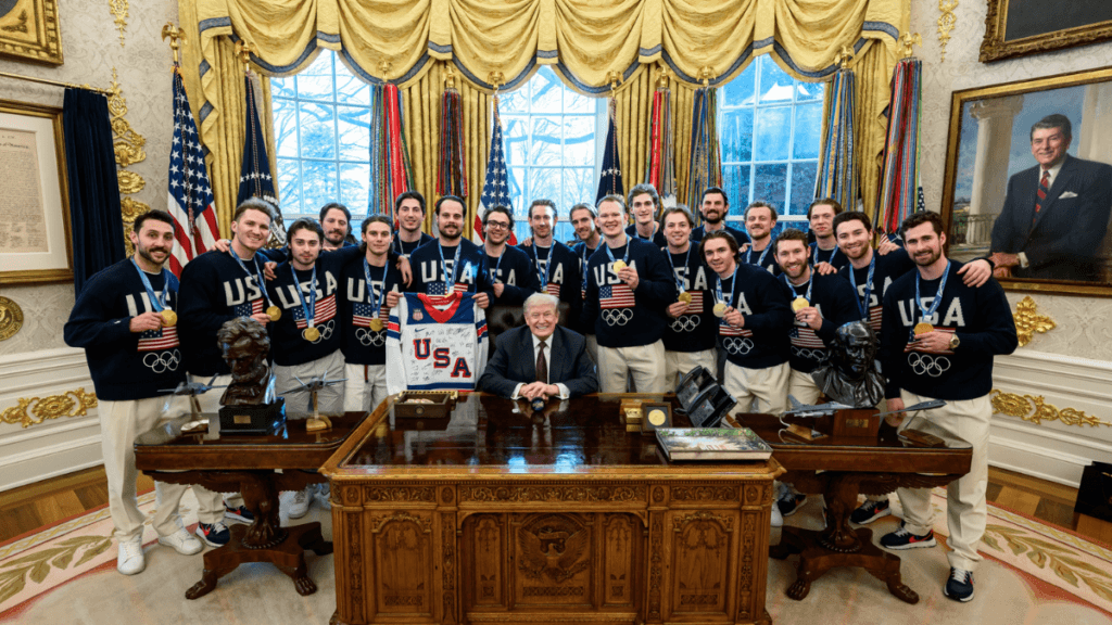 Të martën pasdite, presidenti republikan priti shumicën e anëtarëve të ekipit të hokejit për meshkuj të SHBA-së në Shtëpinë e Bardhë, pas ndeshjes së tyre historike fituese të medaljes së artë në Lojërat Olimpike Dimërore në Itali gjatë fundjavës.