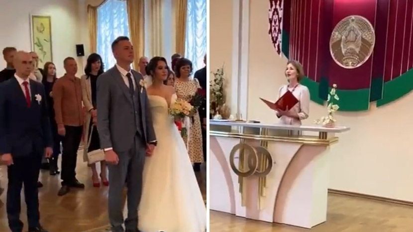 Në fillim, të sapomartuarve dhe të ftuarve u drejtohet ofiqari dhe kamera ngadalë kthehet drejt çiftit të lumtur.
