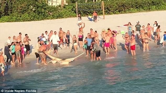 Peshkatarët e kanë nxjerrë krijesën nga uji, që ta shohin vizitorët, dhe më pas e kanë kthyer sërish, megjithëse me pak vështirësi.