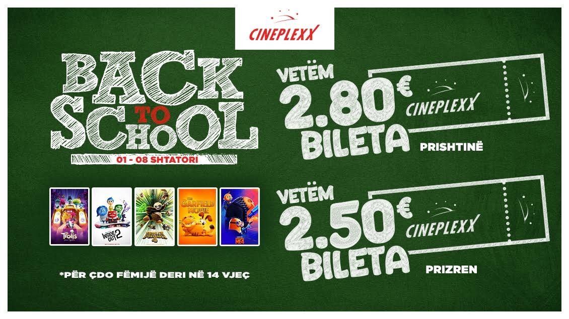 Viti i ri shkollor po afron dhe Cineplexx ka përgatitur një ofertë të veçantë për të ndihmuar fëmijët tuaj të festojnë kthimin në shkollë në një mënyrë të veçantë.Nga data 1 deri më 8 Shtator, kinematë tona në Prishtinë dhe Prizren ofrojnë bileta të veçanta për fëmijët deri në 14 vjeç, për vetëm 2.80€ në Prishtinë dhe 2.50€ në Prizren!Cineplexx sjell "Back to School" duke rikthyer në ekranin e madh filmat më të preferuar të fëmijëve si:- Trolls - Një festë ngjyrash dhe muzikë: Bashkohuni me Trolls në një aventurë të ndritshme dhe muzikore që do t'i bëjë të gjithë të vallëzojnë nga kënaqësia.- Inside Out 2: Zbuloni më shumë për emocionet dhe ndjenjat e brendshme në këtë vazhdim të magjishëm të Inside Out, që do të sjellë emocion dhe ndjeshmëri për të gjithë.- Kung Fu Panda 4: Pandu Po është rikthyer për një tjetër aventurë të jashtëzakonshme plot aksion dhe humor. - Despicable Me 4: Bashkohuni me Gru dhe minionët e tij në këtë episod të ri të plotë me komedi dhe aksion të pafund.- Garfield: Përjetoni aventurat e macës më të famshme dhe të dashur në një film të mbushur me humor.