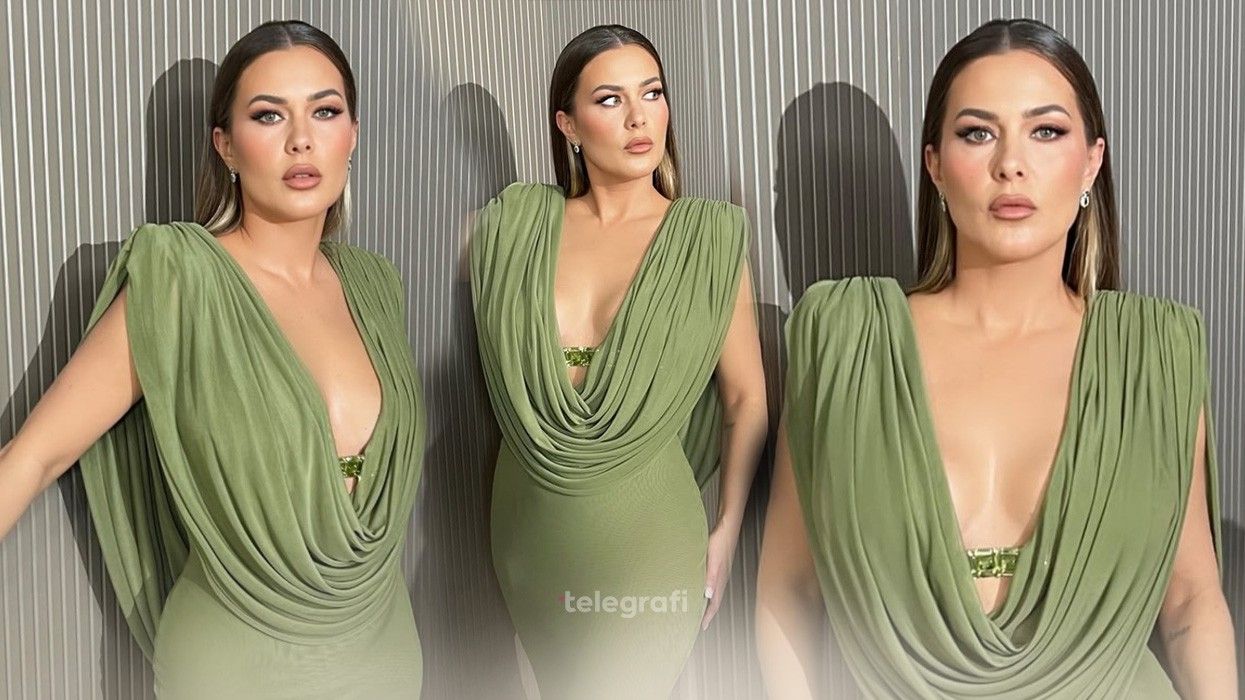 Olta u shfaq me një fustan elegant ngjyrë ulliri, i cili binte në sy për prerjen e tij dramatike me pala të varura në pjesën e përparme dhe të pasme.