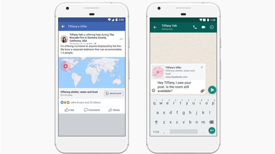 Shfrytëzuesit e Facebookut që përpiqen të ofrojnë ose të kërkojnë ndihmë pas një fatkeqësie natyrore në faqet e platformës Crisis Response, tani mund ta bëjnë këtë edhe përmes WhatsApp, që do të thotë se më shumë njerëz mund ta përdorin këtë opsion shumë të pëlqyer.