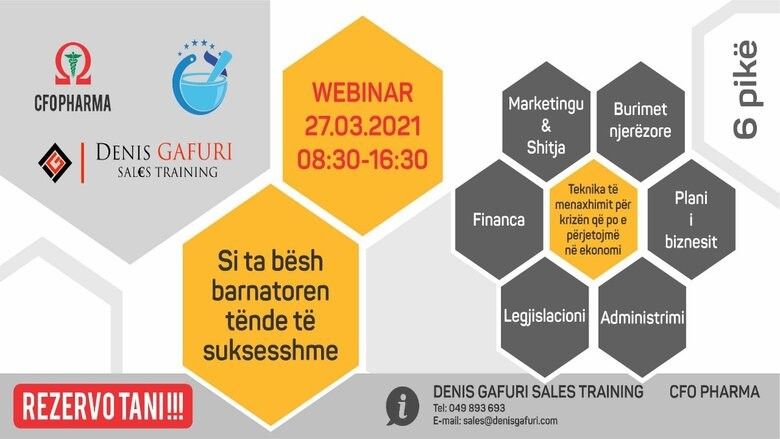 DENIS GAFURI CONSULTING, CFO PHARMA dhe ODA E FARMACIVE të Kosovës organizojnë super seminarin më të madh të farmacive në vend. Me datë 27 mars 2021, është caktuar data e mbajtjes së seminarit më të madh dhe më të rëndësishëm të industrisë farmaceutike. I dedikuar enkas për të gjitha farmacitë. Seminari do të mbahet nga ora 08:30 - 16:30.