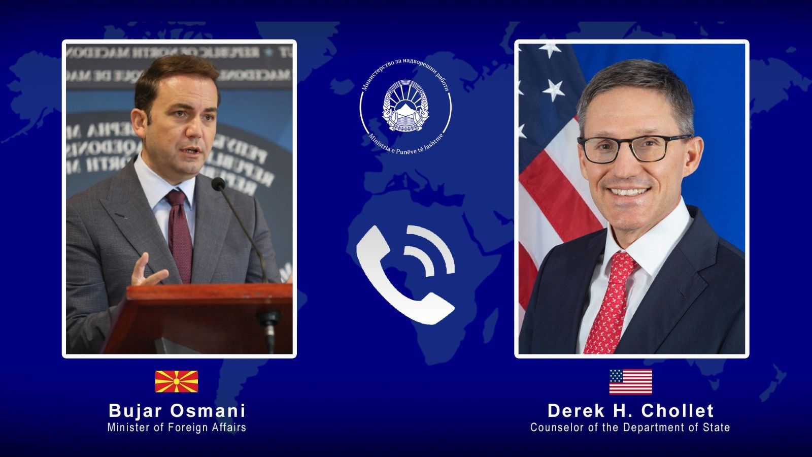 Ministri i Punëve të Jashtme, Bujar Osmani, sot realizoi bisedë telefonike me Derek Chollet, Këshilltar në Stejt Departamentin e ShBA-së, njoftojnë nga MPJ.