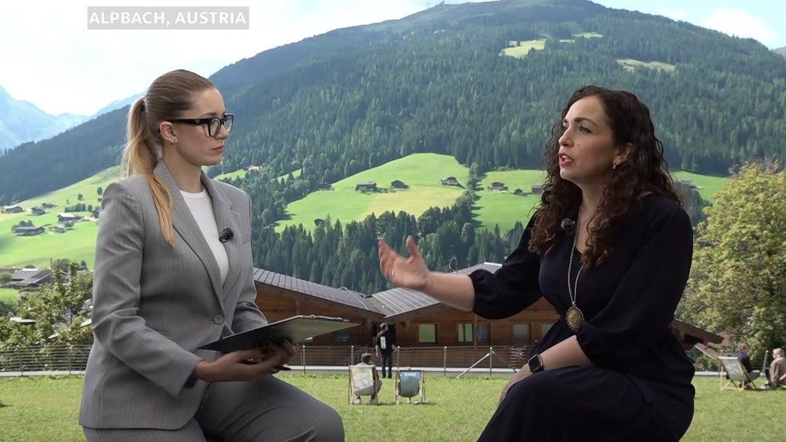 Gazetarja: Mirë se vini në Forumin Evropian Alpbach dhe ju po shikoni TVP World. Është absolutisht kënaqësi të mirëpres në studion tonë këtu në Austri, presidenten e Republikës së Kosovës, znj. Vjosa Osmani. Faleminderit shumë që jeni me ne.