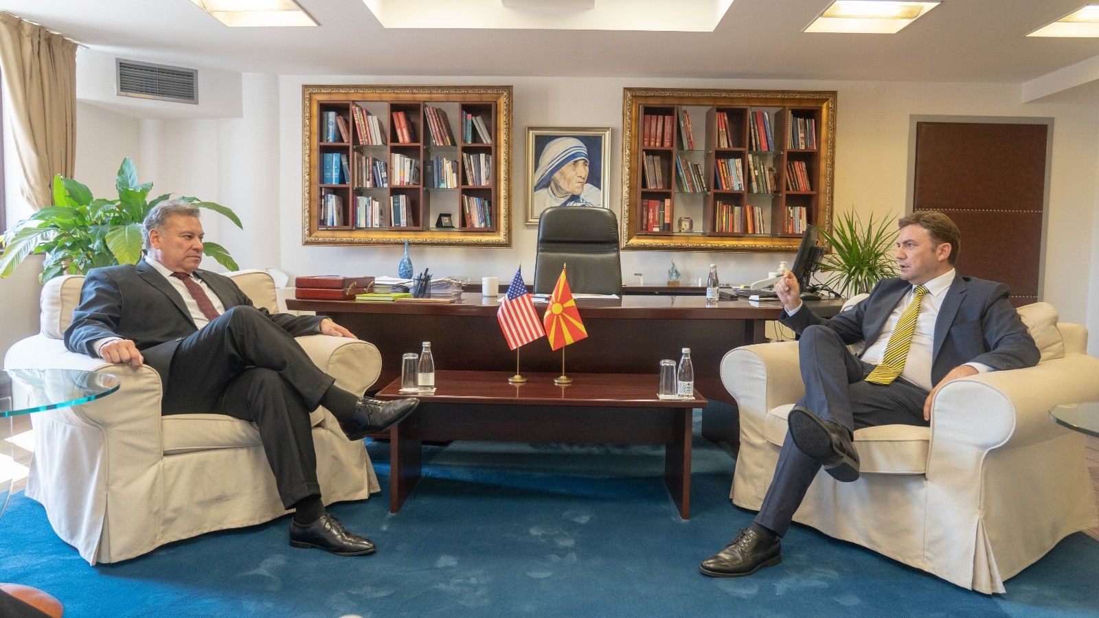 Bashkëbiseduesit shkëmbyen mendime për zhvillimet aktuale politike, me theks në dosjen europiane të Republikës së Maqedonisë së Veriut, si dhe nevojën e vazhdimit të procesit të negociatave me BE-në përmes zbatimit të ndryshimeve kushtetuese.