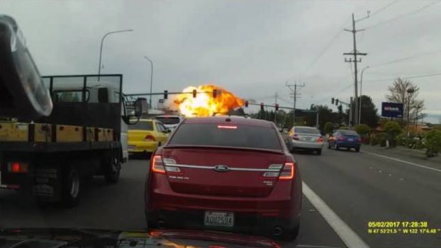 Momenti kur një kamion bie me “hundë” në një autostradë në Mukilteo, Washington është kapur nga kamerat e vendosura në një veturë.