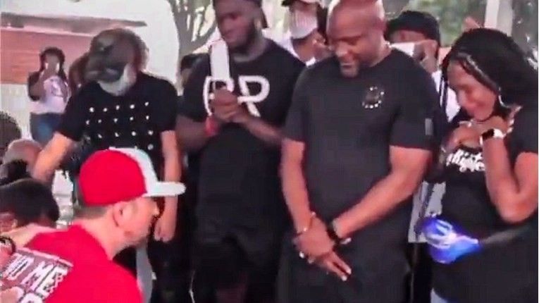 "Ne kërkojmë falje ndaj vëllezërve dhe motrave tona me ngjyrë për vite e vite racizmi, racizëm sistemik", mund të dëgjohet duke thënë një njeri i bardhë që fliste në krye të të mbledhurve, në një fjalim që ishte në të njëjtën kohë një lutje ndaj Zotit dhe një lutje për falje.