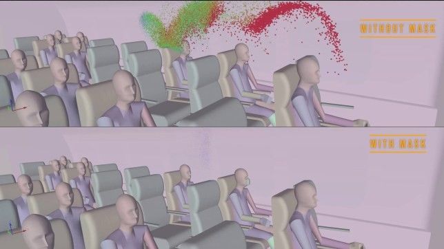 Një video e publikuar më poshtë tregon se sa larg mund të mbërrijnë spërkalat që përhapen brenda aeroplanit, e në veçanti tek personat që nuk bartin maskë mbrojtëse.