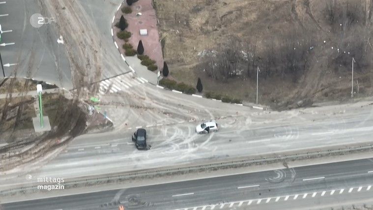 Disa ushtarë rusë rrethojnë trupin e burrit që shihet duke qëndruar i shtrirë në rrugë. E ZDF Heute njofton se vetura e burrit është marrë me “merimangë” nga forcat ruse.