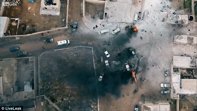 Një video tjetër e filmuar nga ajri shfaq momentin kur civilët sirianë po vraponin për t’i shpëtuar vdekjes, kur një veturë që po lëvizte me shpejtësi të madhe futet në mesin e turmës dhe shpërthen.