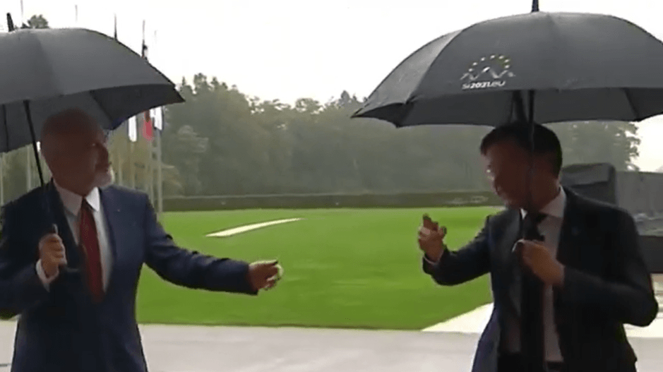 Por pak para se të hyjnë brenda godinës, Rama shfaqet duke ecur në prani të homologut të tij holandez, Mark Rutte.