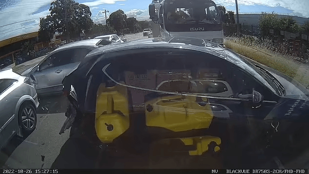 Pamjet e kamerës tregojnë kamionin duke u përplasur me një makinë të vogël argjendi përpara se ta shtyjë atë në pjesën e pasme të një Mazda të ndalur në semafor, transmeton Telegrafi.