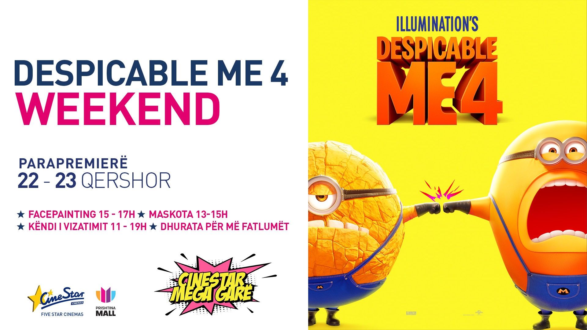 Filmi më i ri i "Despicable Me 4" vjen në CineStar këtë vikend me 22-23 Qershor nga ora 11:00, duke premtuar një përvojë të mbushur me aksion dhe ngrohtësi për familjet.Filmi i ri vazhdon aventurat e Gru, vajzave të tij të adhurueshme dhe Minionëve të djallëzuar. Me përzierjen e tij të humorit dhe momenteve prekëse, ai magjeps audiencën e të gjitha moshave, duke e bërë atë një shëtitje të përsosur për të gjithë familjen. Historia është e freskët dhe tërheqëse, duke i mbajtur të gjithë të argëtuar nga fillimi në fund.Vetëm në Cinestar Megaplex Prishtina Mall familjet kanë mundësi të mahnitshme për të shijuar formatet premium emocionuese apo argëtuese si 4DX 3D, 3D, SCREEN X! 4DX është një sallë me efekte speciale si karrige lëvizëse, era, shiu, ajri, fluska e shumë të tjera. ScreenX është sallë që i lejon të gjithë të shikojnë skenat më të mira nga ky film hit në ekranin e përparmë dhe në ekranet anësore, që shtrihen deri në 270 shkallë. Ndërsa hyni në sallat e CineStar, përvoja e përbashkët e të qeshurit dhe befasisë forcon lidhjet familjare. Prindërit dhe fëmijët njësoj shijojnë kthesat drithëruese të komplotit dhe mesazhin e ngrohtë në thelb të filmit, duke krijuar kujtime të bukura.