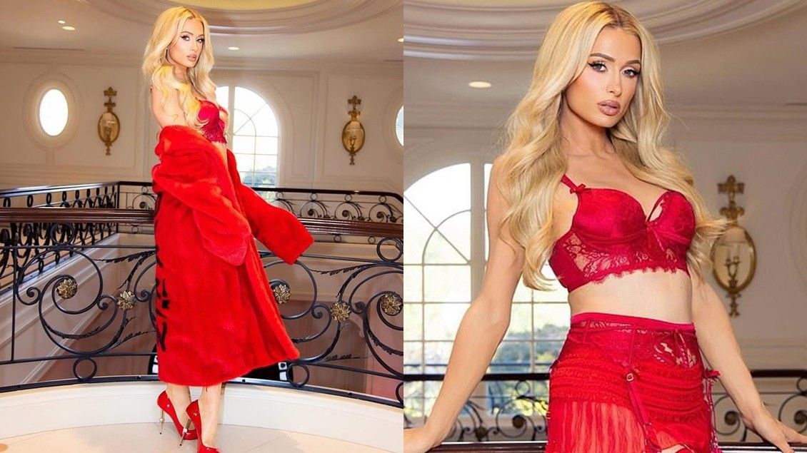 Paris Hilton jep një shfaqje mahnitëse me të brendshme të kuqe, për disa fotografi festive