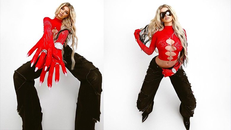 Në fotografi, 27-vjeçarja dukej mjaft atraktive duke pozuar me pantallona të zeza të gjersa dhe një bluzë të kuqe provokuese me prerje të shumta te gjoksi.