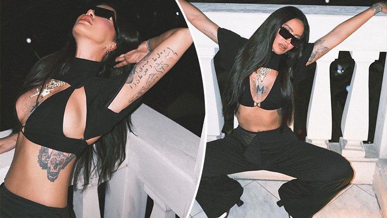 Ajo kishte veshur një palë pantallona të zinj dhe një bluzë të zezë me prerje te pjesa e dekoltesë, e cila vinte në pah tatuazhet dhe gjoksin e saj atraktiv.
