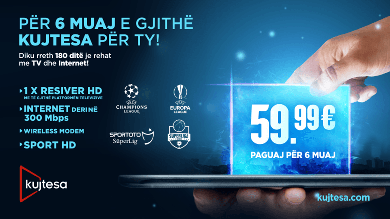 Vizitoni pikat e shitjes të kompanisë Kujtesa dhe informohuni për këtë ofertë promovuese që përfshin 180 kanale nga gjithë rajoni duke përfshirë kanale të përzgjedhura ndërkombëtare, kanalet sportive si Champions League, Europa League, Turkish League, Super Liga e Basketbollit të Kosovës, kanale argëtuese, muzikore si dhe internetin me shpejtësi 300 Mbps.