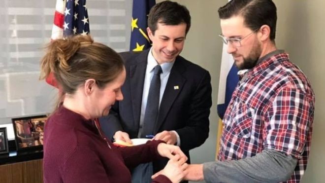 Pete Buttigieg, kryebashkiaku i South Bend, në shtetin e Indianas, tha se palët, Mary dhe Gabe, arritën në zyrën e tij rreth orës 08:15 dhe kërkuan të martoheshin, para se foshnja të vinte në jetë.