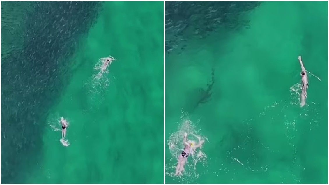 Videoja e shpërndarë nga DroneSharkApp tregon momentin kur dy notarë po shkonin drejt një grupi të peshqve salmon, gjatë zhytjes së tyre mëngjesin e së shtunës në plazhin ikonik Bondi, transmeton Telegrafi.
