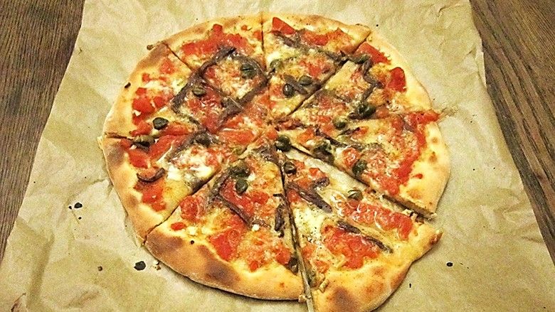 3. Mbi një tryezë kuzhine hidhni miell misri. Në të shtroni petën e picës. Lyejeni sipër me vaj ulliri dhe shtroni salcën e domates. Më pas ullinjtë, sardelet, djathin e grirë kaçkavall dhe spërkatin i me pak vaj ulliri.