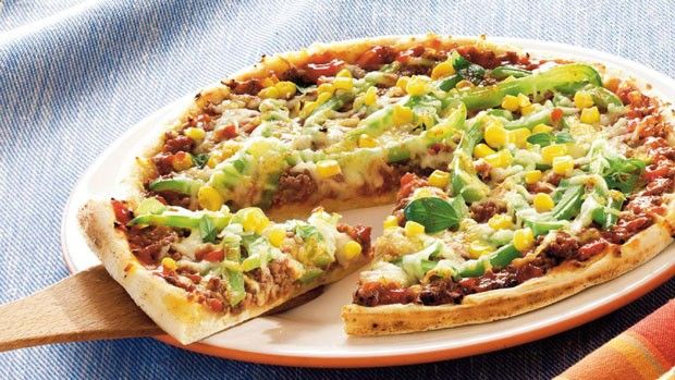 Për katër persona nevojiten:- 500 g mish të bluar, - 500 g miell, - 50 g tharmë të freskët, - 100 ml qumësht, - Një lugë e vogël kripë, - 2 kokë hudhra, - 4 lugë vaj, - 2 speca të gjelbër, - 1 lugë pure domateje, - 1 konservë 400 g domate të qëruara, - 1 lugë erëza për pica, - 350 g misër të ëmbël nga konserva, - 150 djathë të integruar ementaler.Përgatitja: