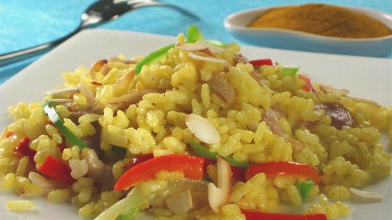 Në margarinën e nxehur fërgoni pak qepën e grirë në rrathë, shtoni orizin dhe bashkë piqni rreth 2 minuta. Pastaj shtoni ujin, shafranin dhe erëza.