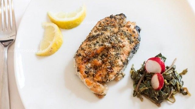 Vendosim tavën në furrë të piqet në 180-200°C përreth 20 minuta. Kur të shohim një sipërfaqja ka krijuar një kore të bukur të artë e heqim tavën nga furra. Shërbejmë salmonin të ngrohtë duke e shoqëruar me perime të stinës ose me patate furre. /Telegrafi/
