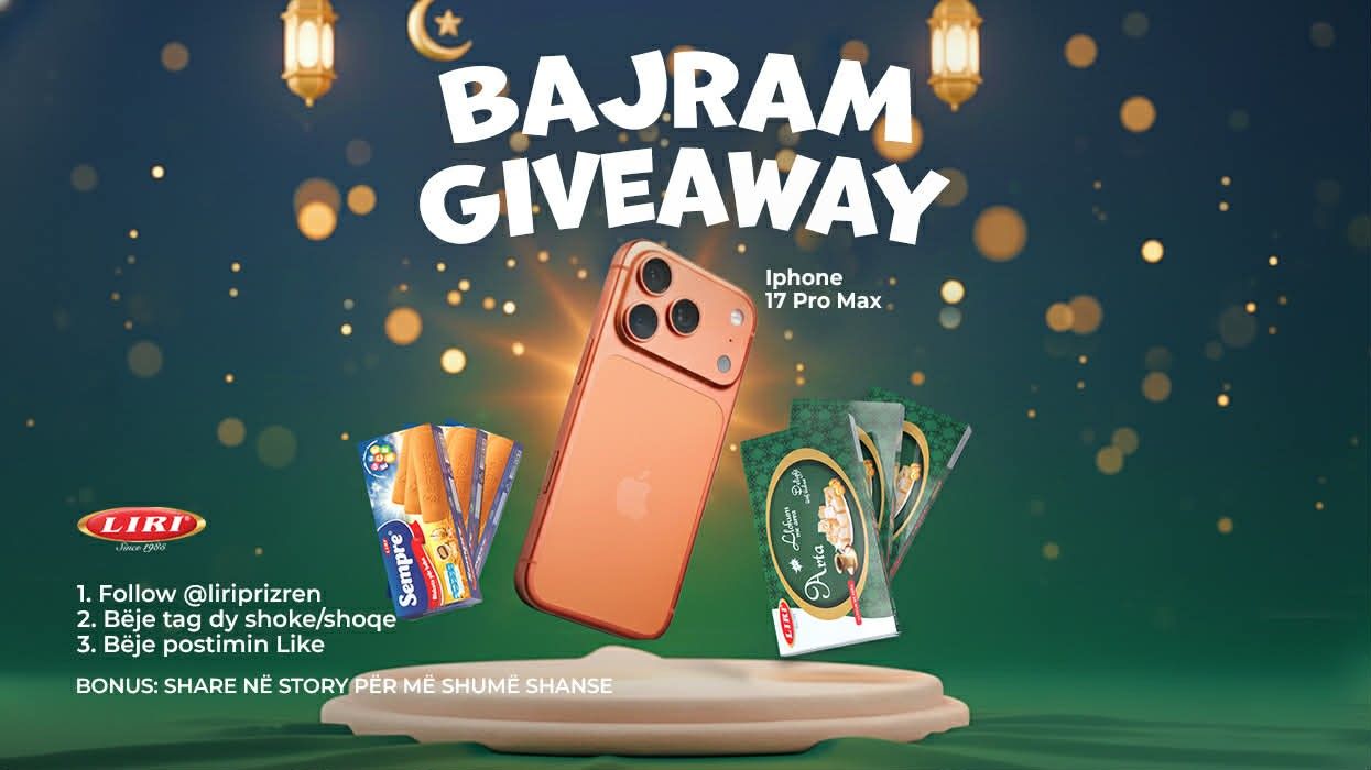 Prodhuesi i shijeve të ëmbla Liri ka nisur një lojë shpërblyese në rrjetet sociale me rastin e festës së Bajramit, si një falënderim për klientët dhe ndjekësit besnikë, duke u dhënë mundësinë të fitojnë një iPhone 17 Pro Max dhe produkte nga linja e kompanisë.