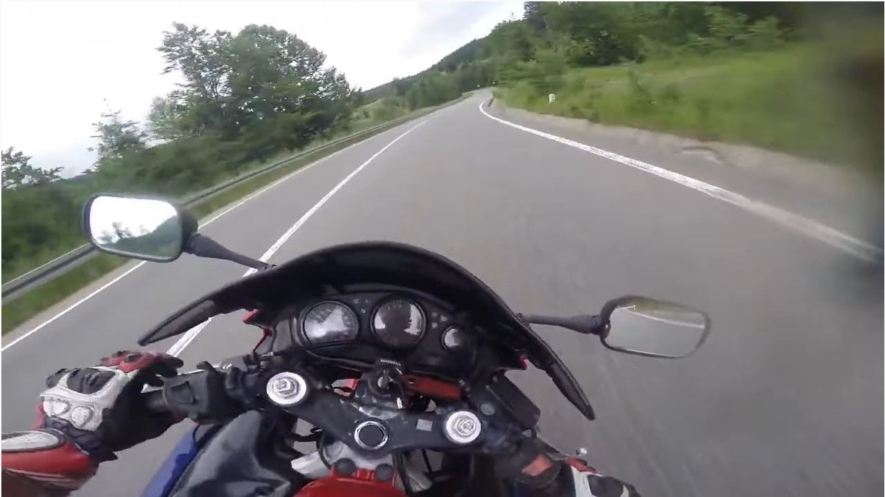 Po lëvizte me shpejtësi të madhe më motoçikletë, kamera e vendosur në helmetë kapi momentin kur ai rrëzohet