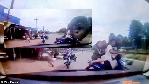 Një grua shtatzënë e cila po qëndronte në anën e pasme të një motoçiklete në Tajlandë i shpëtoi gomës që 'fluturoi' në drejtim të saj.