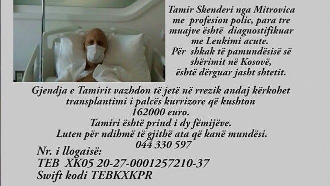 Tamir Skenderi nga Mitrovica, polic i Kosovës, është diagnostifikuar para tre muajsh me Leucemi Acute. Në pamundësi për t’u shëruar në Kosovë, është dërguar për shërim në Turqi.