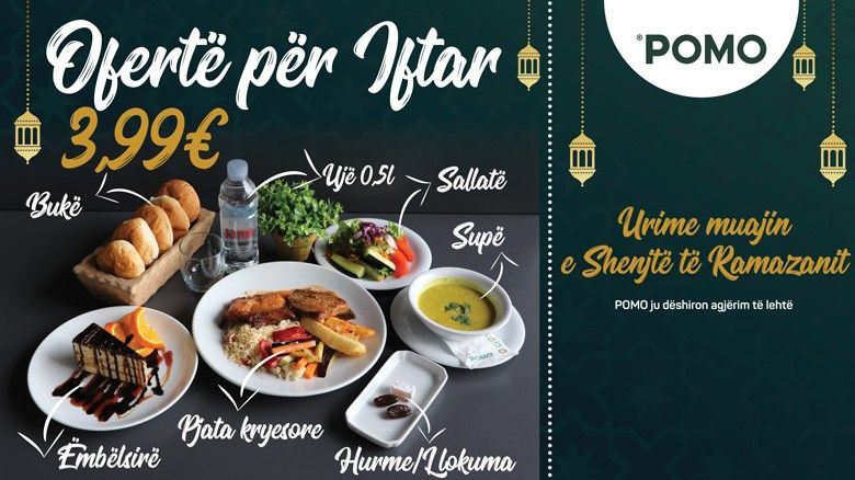 Stafi i Pomo-së ju shërben në kohën e duhur për iftar me ujë dhe hurma ose llokuma për të thyer agjërimin siç është thyer tradicionalisht. Më pas, shërbeheni me supë shtëpie, sallatë me perime të freskëta dhe bukë. Për pjatën kryesore ju mbetet juve të zgjedhni nga ushqimet e shumta të përgatitura nga Pomo. Ndër të tjera, ju mund të zgjedhni një prej këtyre ushqimeve: oriz integral, pilaf, qofte, gordon blue, lazanja, file pule, pulë curry, pulë chilli, etj. Në fund, iftarin e përmbyllni me një nga ëmbëlsirat e përgatitura me shumë kujdes dhe dashuri - ju vetëm duhet të zgjedhni prej tyre.Deri më tani, të gjithë ata të cilët kanë ardhur për të ngrënë iftar në Pomo janë ndarë të kënaqur me shërbimet, cilësinë e ushqimit dhe ambientin e restaurantit. Kjo është oferta më e mirë që mund të gjeni për iftar. Ftoni familjar dhe miq për një iftar të paharruar, në një ambient të rehatshëm dhe me çmim të lirë.(artikull i sponsorizuar)