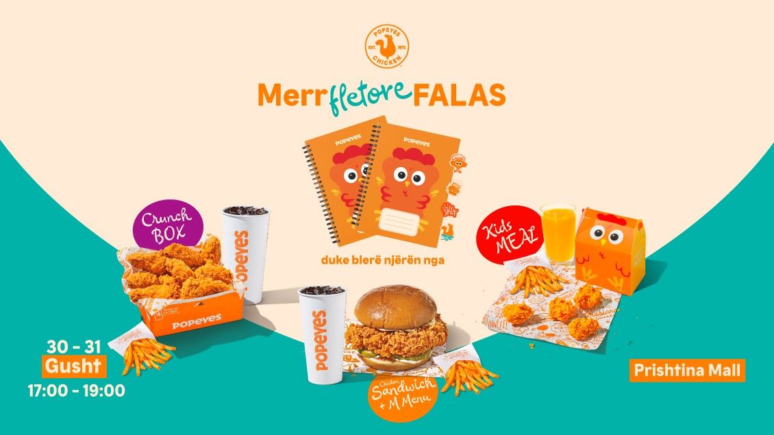 Përveç atmosferës së gjallë dhe ushqimeve të papërmbajtshme, Popeyeska menduar edhe për një surprizë të ëmbël: me çdo blerje të një Crunch Box, Kids Meal ose Chicken Sandwich me M MENU, vizitorët do të përfitojnë një fletore falas – një dhuratë simbolike që e bën fillimin e shkollës edhe më të bukur.