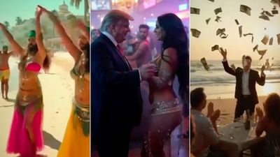 Njerëzit vallëzojnë ndërsa kartëmonedhat e dollarëve bien nga qielli, ndërsa një i ngjashëm me Elon Musk shijon një pjatë me ushqim, duke u shijuar në spektaklin që ishte organizuar.
