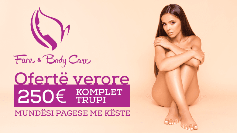 Face & Body Care nuk ju lejon të neglizhoni bukurinë e trupit tuaj me super ofertën e fundit, ku për 250 euro ju e depiloni gjithë trupin në 5 seanca. Madje, këtë pagesë mund ta bëni edhe me disa këste!