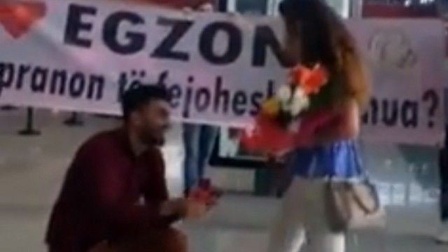 “Egzona, a pranon të fejohesh me mua?”, ishte baneri i madh që e priti Egzonën në aeroport, transmeton koha.net. Ndërsa, me t’u takuar me të, djaloshi nga Kosova, emri i të cilit ende nuk dihet, u ul në gjunjë dhe ia vuri unazën në gishtin e fejesës.