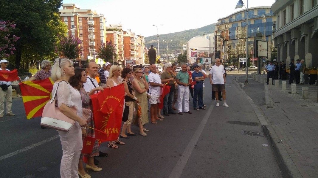 Bëhet fjalë për anëtar të Shoqatës "Bllazhe Koneski", të cilët protestuan në mënyrë paqësore para Ministrisë së Punëve të Jashtme, ndërsa më pas grupi u mblodh në afërsi të katedrales në Shkup, ku te sheshi "Kliment Ohridski" u vendos një skenë e improvizuar.