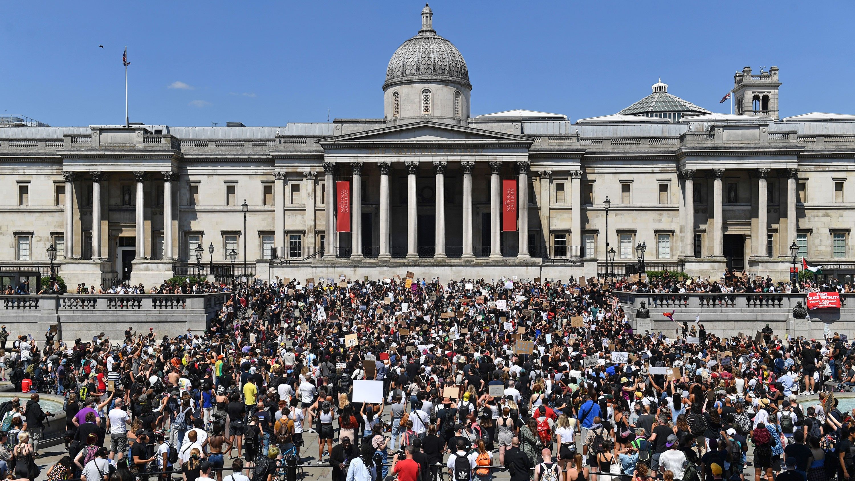 Turmat u mblodhën në sheshin qendror Trafalgar të Londrës për të protestuar kundër racizmit dhe brutalitetit të policisë, megjithë rregullat e distancimit shoqëror që synonin të kufizonin përhapjen e coronavirus, transmeton Telegrafi.