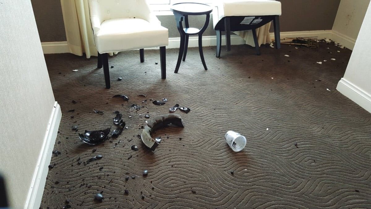 Pastaj e tërhoqi zvarrë nëpër dysheme, siç mund të shihet në video. Ventura pastaj mbeti ulur në dysheme ndërsa u kthye në dhomë. Pastaj u ngrit dhe u kthye në ashensor.