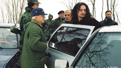 Në këtë imazh, Kurti shihet teksa futet në një veturë, ndërsa përreth tij ndodhen disa ushtarë të Ushtrisë Çlirimtare të Kosovës (UÇK), të cilët asokohe ishin në vijën e parë të rezistencës kundër regjimit serb.