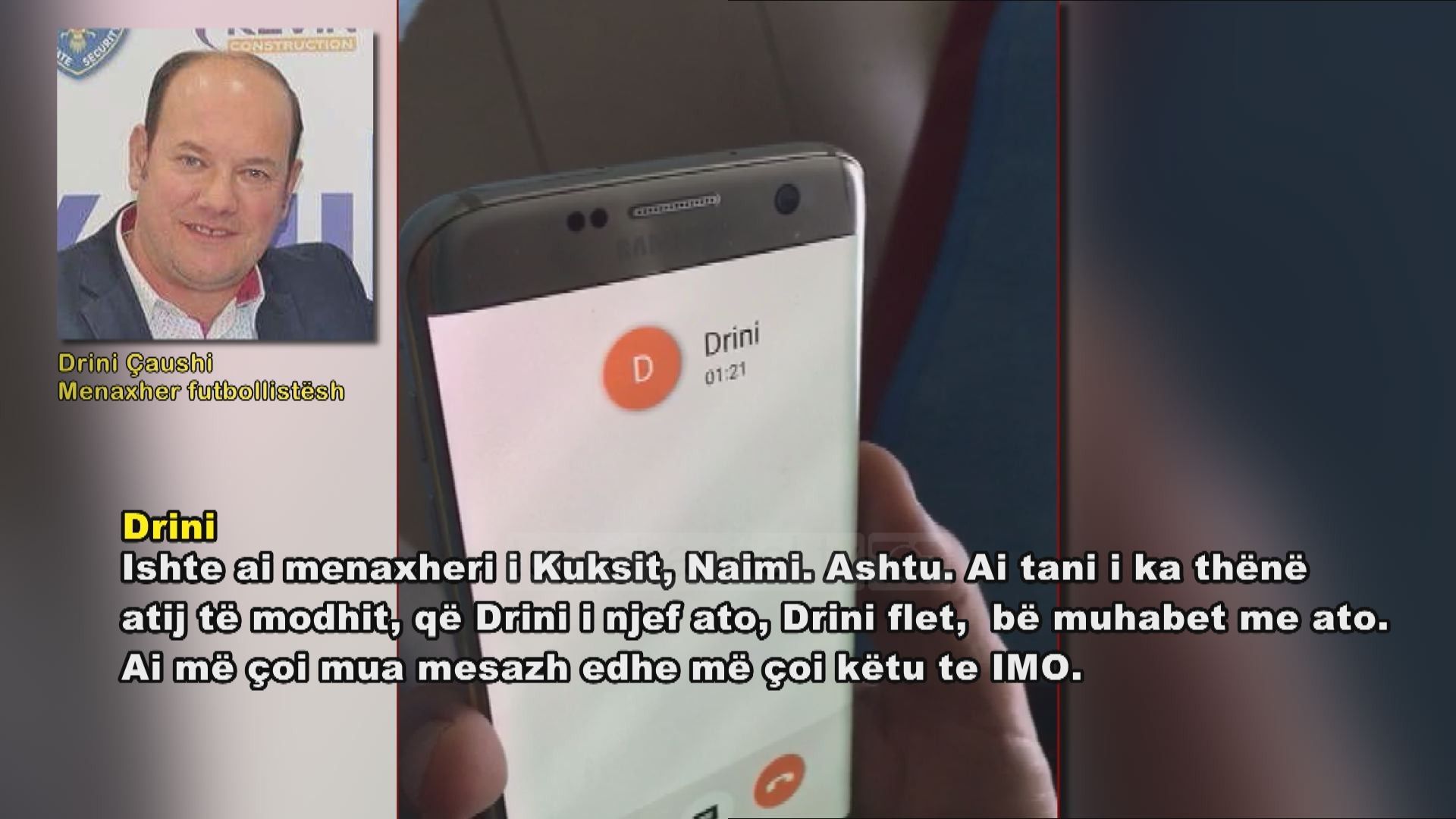 Drini: Ishte ai menaxheri i Kuksit. Naimi. Ashtu. Ai tani i ka thënë atij të madhit, Drini i njef ato, Drini flet, muhabet me ato. Ai më çoi mua mesazh, edhe më çoi këtu te “IMO” , më mori vet i madhi pastaj.