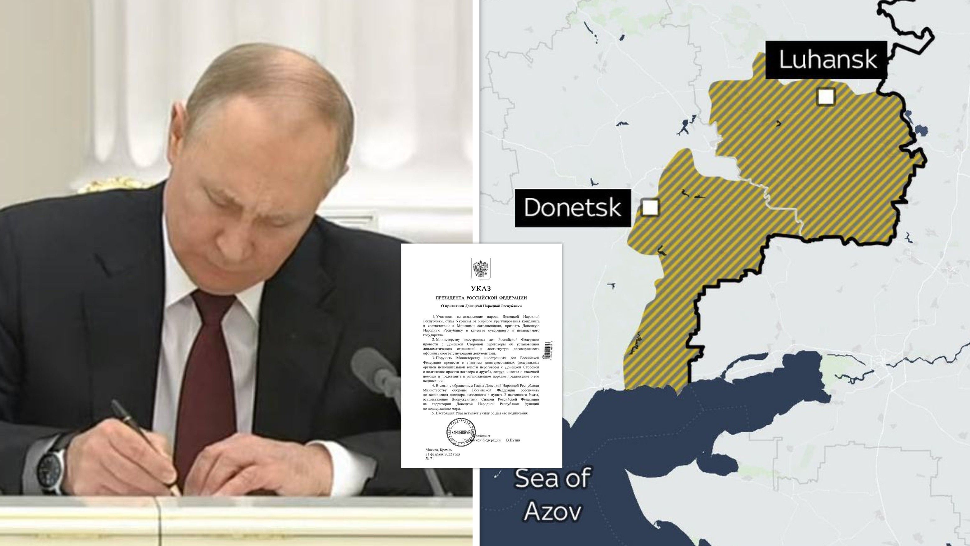 Në momentet që Putin po shpjegonte arsyet se pse ka vendosur të nënshkruaj dekretin për njohjen e këtyre dy rajoneve separatiste në lindje të Ukrainës, një konvoj ushtarak – pra me autobusë dhe tanke janë shfaqur, transmeton Telegrafi.