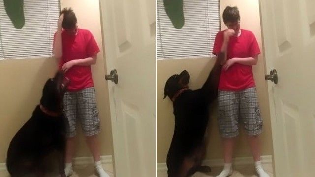 Ajo e qëllon vetën në kokë dhe gjoks, kurse qeni i quajtur Samson, shfrytëzon putrat për të ndaluar atë në procesin e vetë-lëndimit.