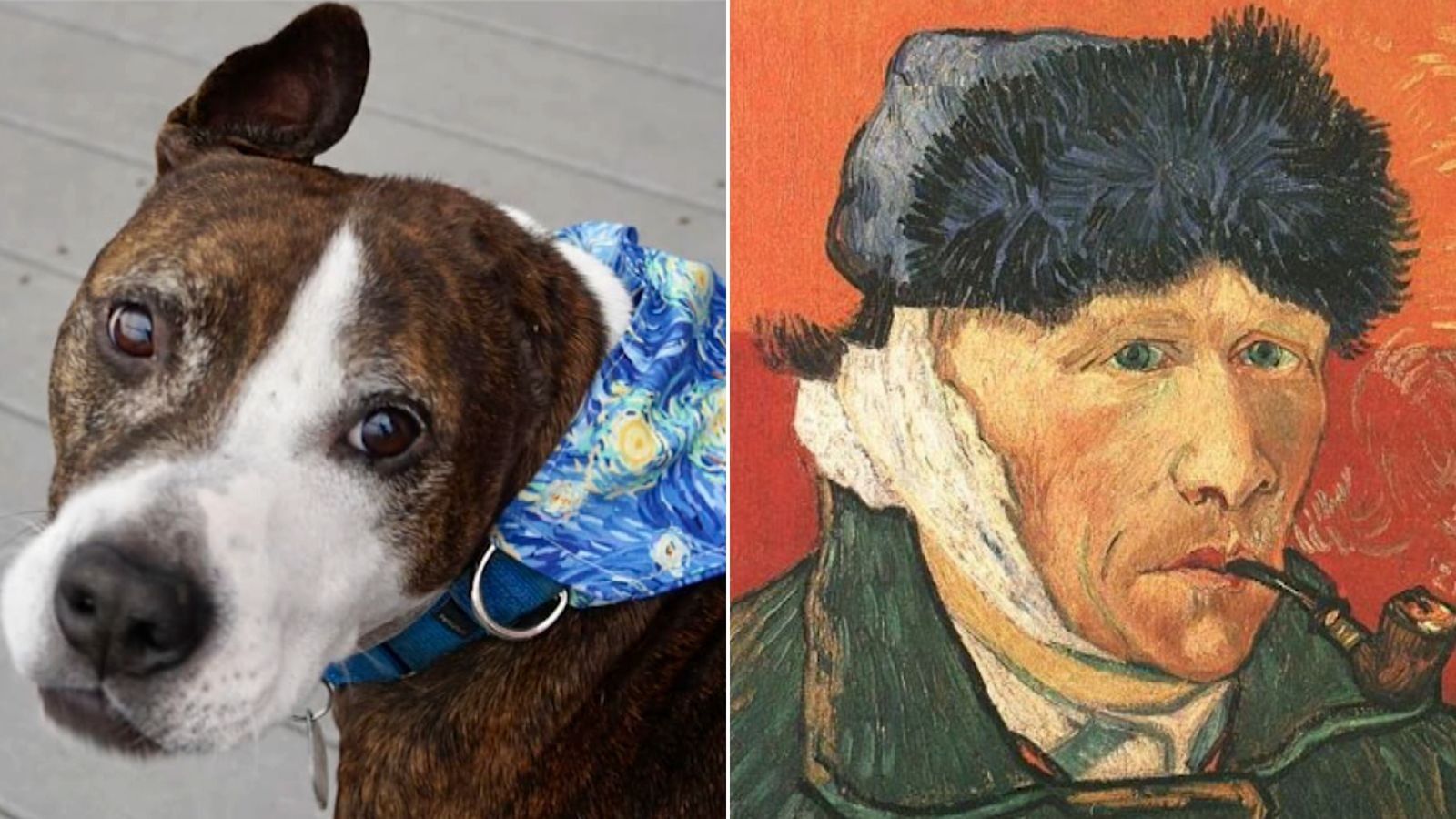 Van Gogh, një qen 7-vjeçar i racave të përziera boxer-pit bull, u shpëtua nga një ring luftimi i qenve në Karolinën e Veriut dhe kishte lëndime aq të rënda në vesh saqë duhej të amputohej, deklaruan nga Happily Furever After Rescue.