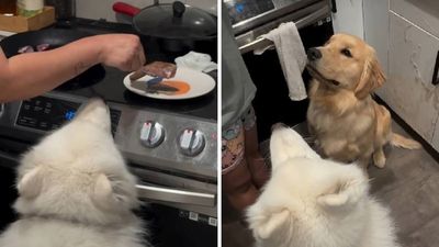 Një shembull prekës i një pritjeje të tillë vjen në një video që tregon dy qen duke pritur me durim në kuzhinë për vaktin e tyre të veçantë, një biftek.
