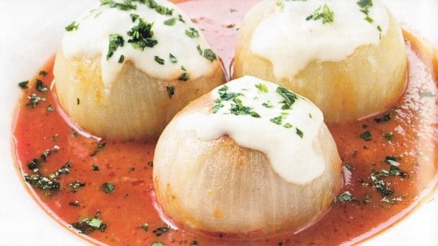 9. Ena rezistuese ndaj zjarrit lyhet me gjalpë, renditen në të kokat e qepëve të mbushura, u derdhet përmbi lëng domatesh dhe qepët piqen, derisa të skuqen, në furrën e nxehtë paraprakisht në 200 gradë Celsius. Nga fundi i pjekjes, në çdo kokë qepe të mbushur vendoset nga një kube djathë mocarela dhe qepët kthehen sërish në furrë e piqen derisa të shkrihet djathi.