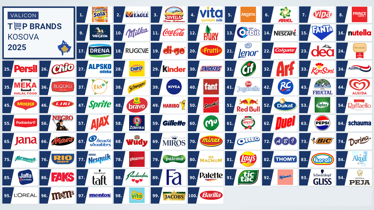 Në mesin e 10 brendeve më të fuqishme për vitin 2025 përfshihen gjithashtu Divella, Vita, Argeta, Ariel, Vipa Chips, Prince Caffe, Vegeta dhe Milka.