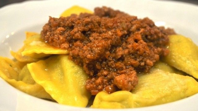 Fillojmë e përgatisim edhe salcën. Presim mishin në copa shumë të vogla me thikë ose nëse keni makinë grirëse mund ta bëni metë. Në tigan hedhim pak vaj ulliri dhe grijmë hollë qepën. E kavërdisim pak e më pas shtojmë edhe karrotën dhe selinonë e grirë hollë. I kavërdisim për disa minuta me zjarr të ulët dhe pastaj shtojmë mishin. E trazojmë mirë dhe e lemë të kavërdiset me zjarr të fortë. Më pas e shuajmë me verë të bardhë dhe e lemë derisa të avullojë alkooli. Më pas ulim zjarrin dhe shtojmë domatet e grira. Hedhim erëzat, pak kripë e pak piper dhe mbulojmë tiganin me kapak. E lemë të piqet ngadalë dhe mund të shtojmë edhe ½ gote ujë ose lëng mishi që të vazhdojë zierja.