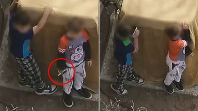 Pamjet tronditëse nga droni tregon djalin më të vogël që përpiqet ta mbajë armën fort - asnjëri nuk duket se e kupton seriozitetin jetë a vdekje të asaj që po ndodh.